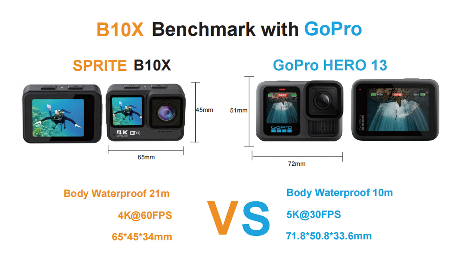 - Dual Screens: GoPro’s front LCD is reserved for premium models (e.g., HERO12 Black), while the B10X offers dual screens as a standard feature.